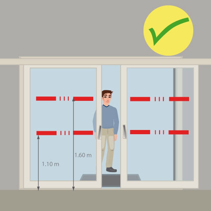 Une mise en conformité aux normes d'accessibilité impose de placer 2 bandes adhésives de 5 cm de largeur sur toute la longueur de la surface vitrée à 1,10m et 1,60m de hauteur.