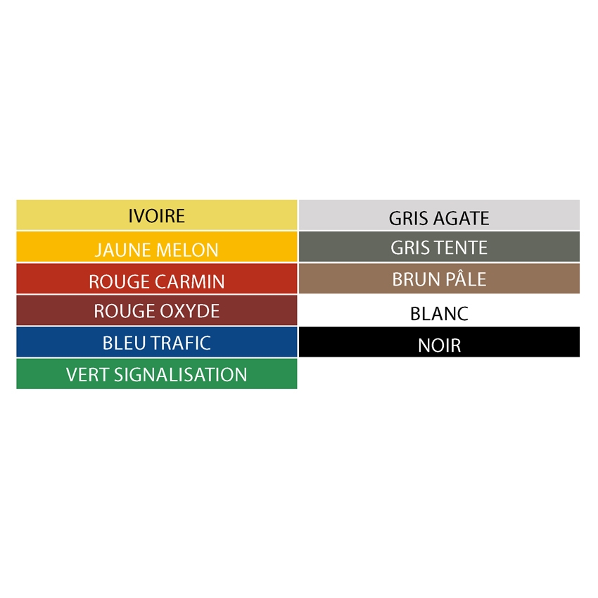 - Coloris : ivoire, jaune melon, rouge carmin, rouge oxyde, bleu trafic, vert signalisation, gris agate, gris tente, brun pâle, blanc ou noir